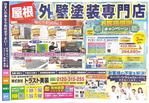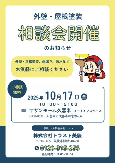 福岡県筑後市、大川市、久留米市、八女市、佐賀市、柳川市の住宅塗装、外壁塗装、屋根塗装、防水工事のトラスト美装。住宅・アパート・工場・店舗などの塗替えやペンキ塗りのリフォームはお任せください。プロの塗装職人が本物の塗装工事を行います。ご相談・現地調査・お見積り無料