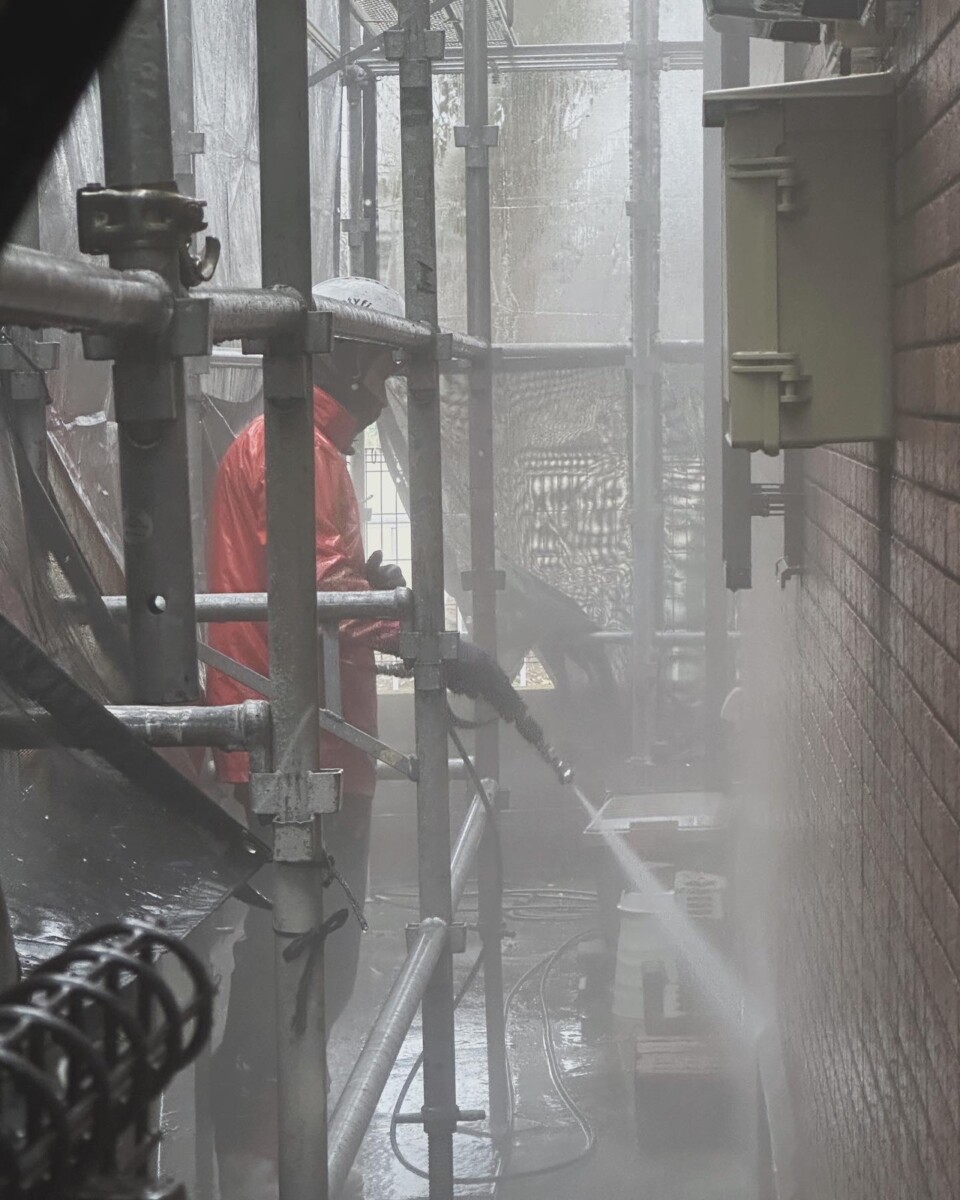 こんにちは😊本日は雨ですが、昨日着工した現場は動いてます!足場組み立て後は、まず洗浄作業です❗️雨の中、お疲れ様です🫡隠し撮り成功です✌️