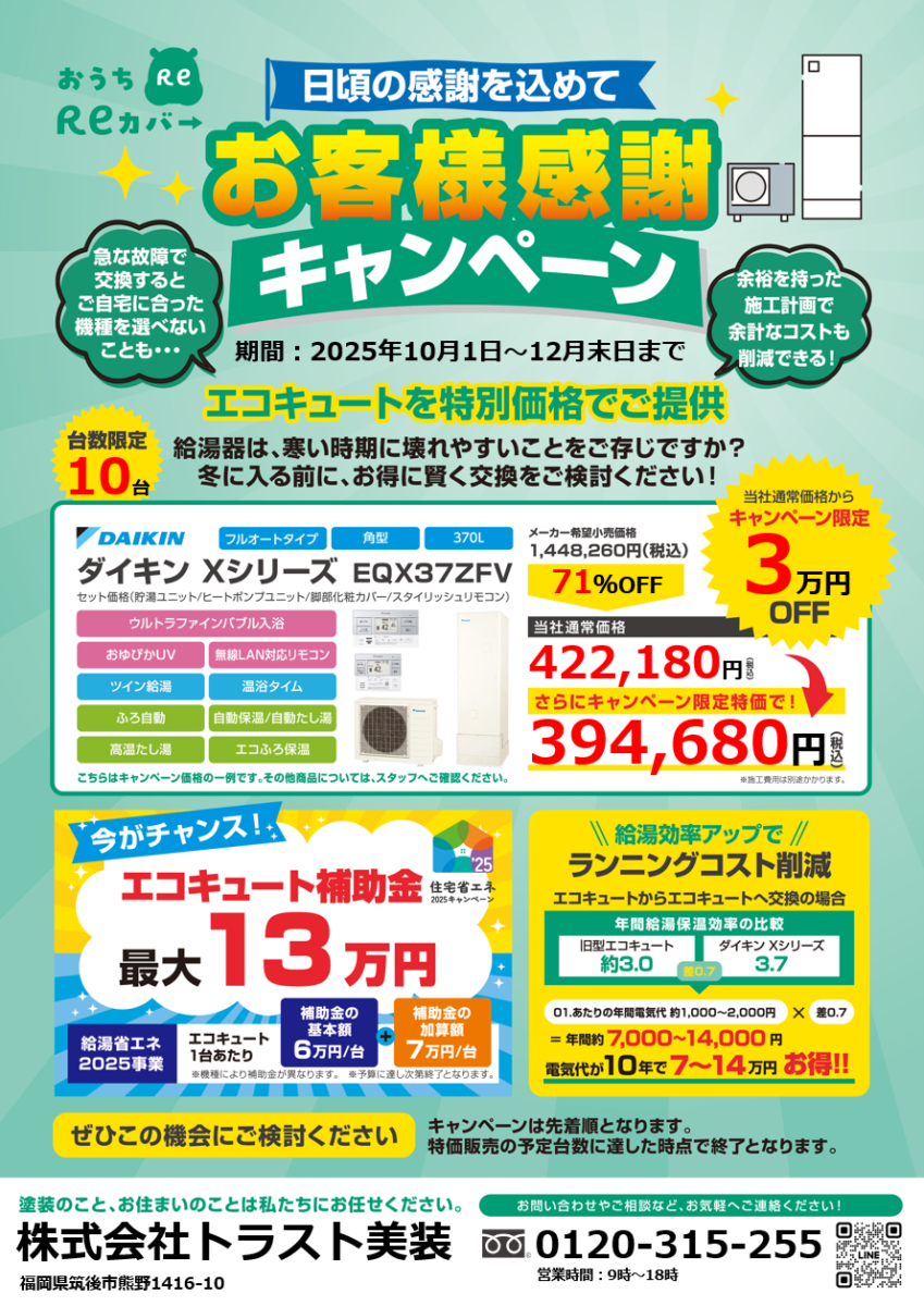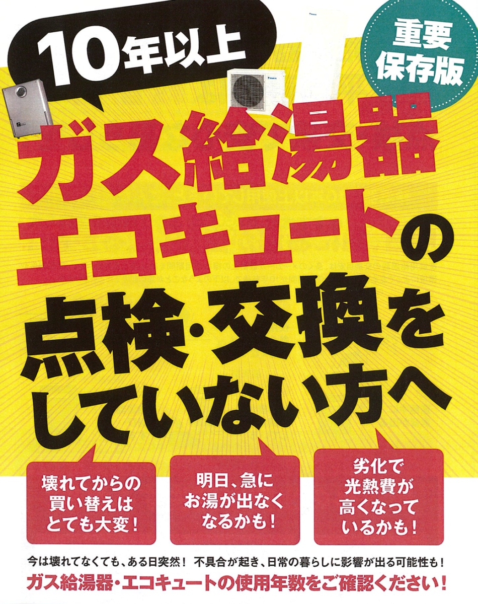 10年経った給湯器・エコキュートをお使いの方、点検等弊社で行っておりますので