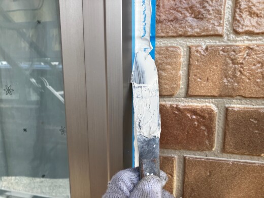 破風目地のコーキングが劣化していたので撤去し、新しいコーキングを充填していきます。