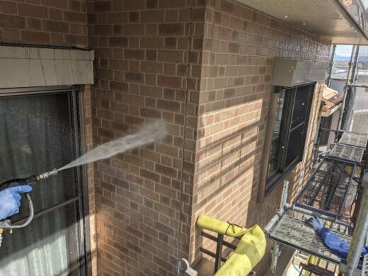 レンガ調のサイディング部分が模様が残る様、クリヤーで塗装を行います。