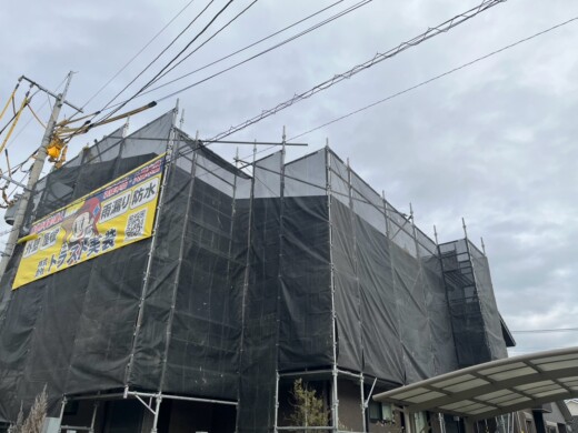 足場組立を行い飛散防止、落下防止用のメッシュシートを張ります