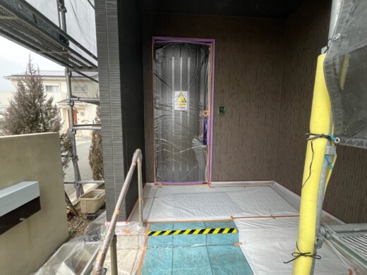 塗装に入る前に玄関廻りやサッシ窓などに養生テープで保護していきます