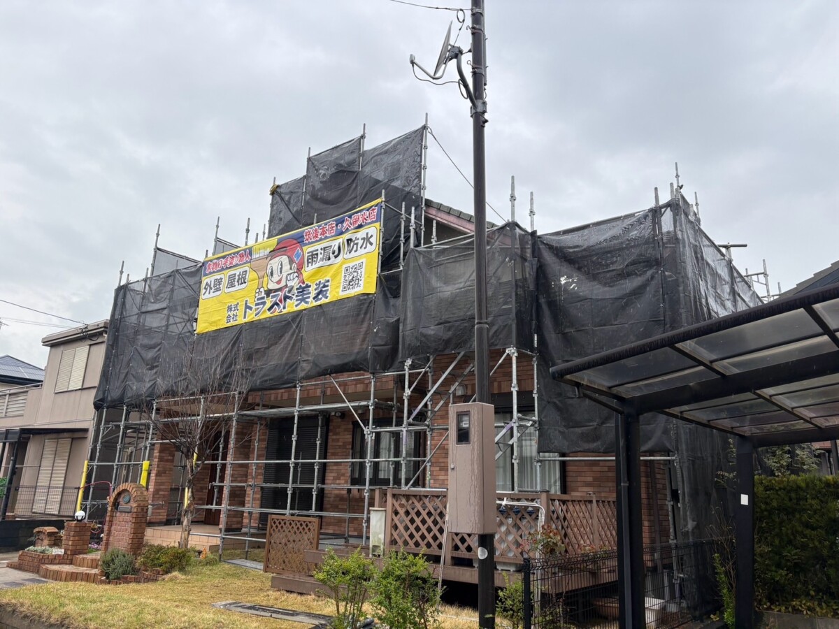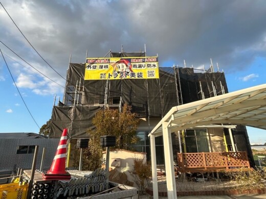 足場組立を行い、飛散防止・落下防止用のメッシュシート張りを行います