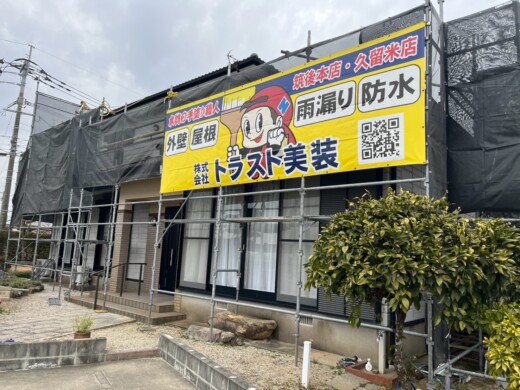 着工当日は足場組立を行い、飛散防止、落下防止用メッシュシート張りを行います