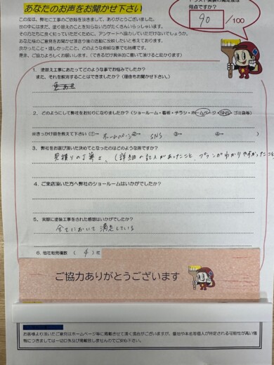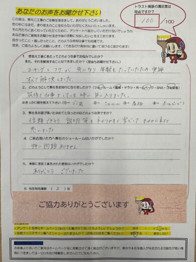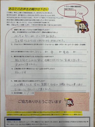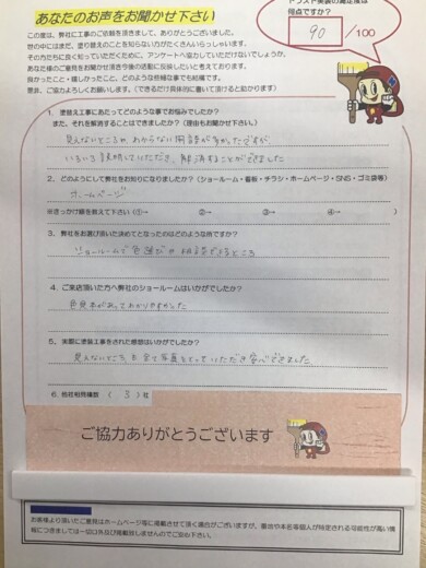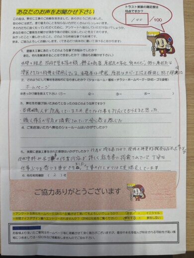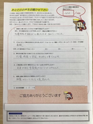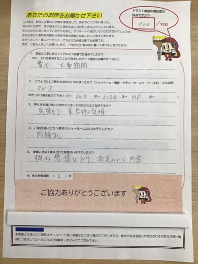弊社に御依頼を受け、私達は誠心誠意、心を込めて施工させて頂きました。しかし、私達の気付かないところ、心配りが足りない点もあったかと思います。そこで・・・お客様にアンケートに御協力頂き、お客様の声を頂きました。お客様から頂いたご意見は当社の財産です。ご意見・ご感想をしっかり受け止め、より多くの方々に喜んで頂けるように更なる努力をいたします。