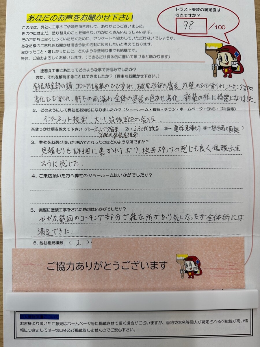 お客様から頂いた貴重なご意見をしっかり受け止め、今後の工事に生かし更なる努力を致します。