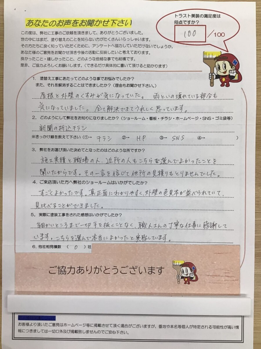〔●施工実績と職場の人、近所の人もこちらを選んでよかったことを聞いたからです。その一言を信じて他社の見積りもとりませんでした。〕